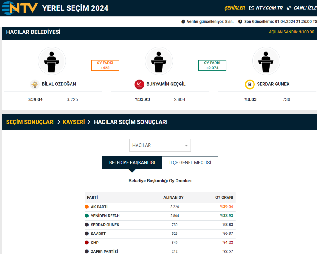 Genel2024 Hacılar Seçim Sonuçları NTV Seçim sonuçları için tıklayın Kesin olmayan sonuçlara göre ilçemizde mücadele eden partilerin 2019 seçimlerine göre sergiledikleri performans listesi. lçemizin kaderini bağımsız aday belirledi.10 siyasi partiyi geride bırakarak 3.sıraya yerleşmeyi başardı. Aldığı oy 1. ve 2. parti arasındaki farktan fazla.